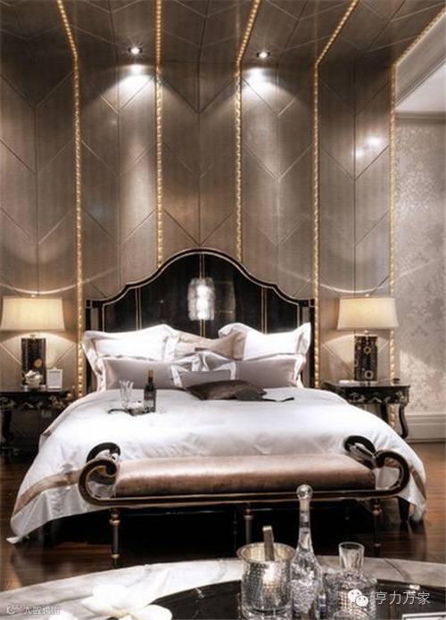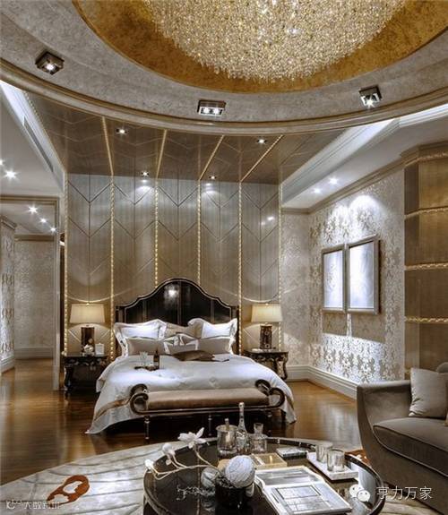 天花板以金色为顶,悬挂浅茶色水晶吊灯,色彩上融为一体,与银色墙面相呼应,在壁灯灯光照射下,营造了卧室富丽堂皇、金碧辉煌的感觉。