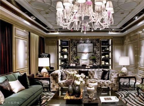 客厅墙面均采用石膏板进行勾勒、造型,西方宫廷风格的墙面造型与欧式短绒沙发营造了客厅温馨、典雅、高贵的氛围。