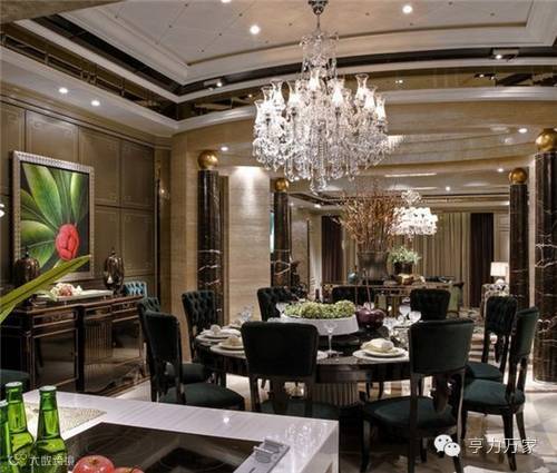 餐厅沿袭了古典欧式中如贵族一般奢华、高贵的风格,在如繁花造型的水晶吊灯下,墨绿色的绒布靠背椅与色彩浓烈的装饰画散发着典雅大方,温馨精致的气质。