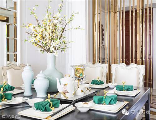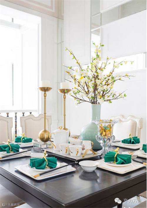 餐桌上方金色吊灯、绿色餐巾、金色餐巾扣与主花形成了主从关系,花艺成为无可替代的点睛主角。