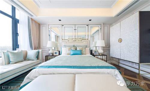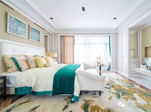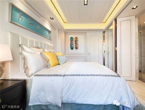 卧室空间同纬度的孔雀绿和孔雀黄继续作为主要点缀色连贯着整个居家空间,散步在装饰画、抱枕、墙上悬挂的滑板中,用这两种清新怡人的色彩,组合成一个色彩围合,墙面上椭圆挂饰起到了绝对的领袖作用。