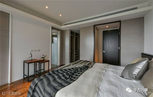 木地板、中式边几在色彩设计上有同工之妙,更与玄关处的桌几相呼应,在整体主题风格设计上统一、和谐。床品沿袭了整体软装中的自然质朴特点,卧室设计舒适、轻盈。