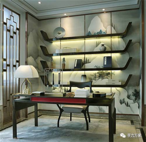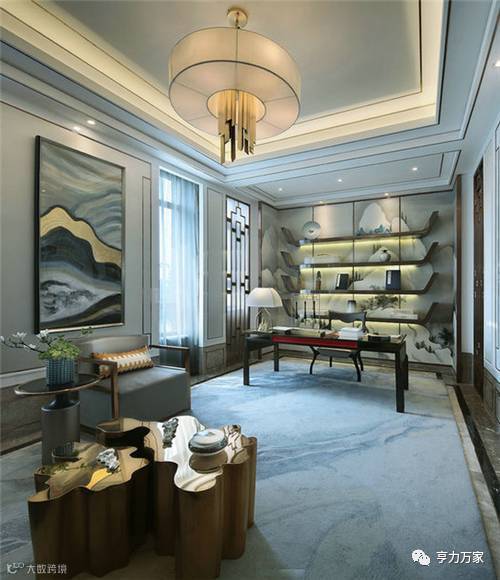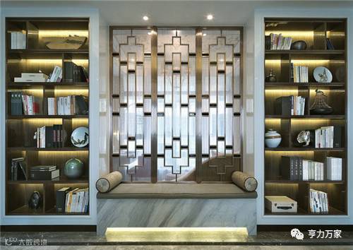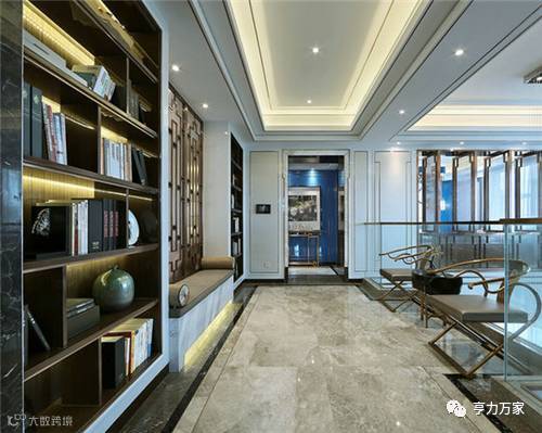 干净利落的线条,静谧的灰、素简的白、优雅的棕。走道打破狭长增设书廊,采用透、挑、借等中式建筑设计手法营造了一个凭栏阅的书香意境。