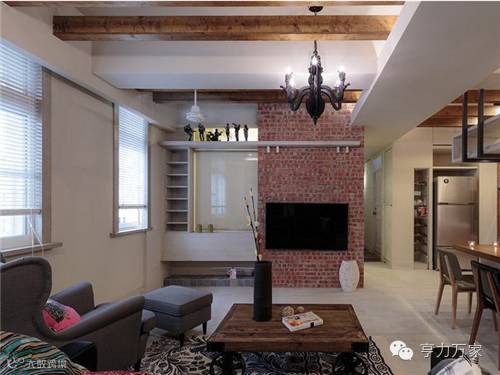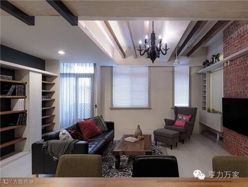 以红色文化砖作为电视主墙,粗犷中又带有乡村风的迷人气息。一旁以玻璃作为与游戏室的分界,将窗帘拉起时,可保有视觉穿透感,让屋主在客厅可以看顾小孩的一举一动。