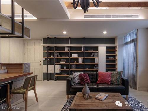 开放式的书墙,以藏青绿的墙面,搭配实木层板与铁件,尽展个性人文风采。