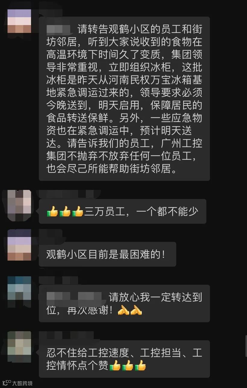 “天气太热,食物容易变质。”此前,广州工控在关注到社区物资配送过程中食材容易变质的问题后,紧急协调河南民权万宝冰箱基地调运10台冰柜,并于6月8日晚送达荔湾观鹤小区,不到三天的时间,就为社区居民解决了食品转送保鲜难题。当晚,被工控速度、工控精神所感染的集团主要领导发出感慨:“我们不抛弃不放弃任何一位员工,也会尽己所能帮助街坊邻居!”。