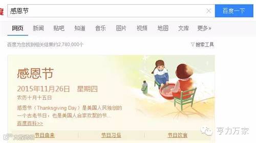 但是当您在百度数日“感恩节”三个字的时候,出来的结果是这样的:感恩节是美国人独创的一个古老的节日,也是美国人合家欢聚的节日......不知道百度是不是在暗示搜索的人,这个节日其实是“外国人”的,你们中国人就别瞎凑热闹啦!