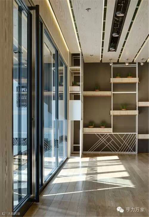 木与玻璃,简洁的线条,几盆植物,空间大而通透。