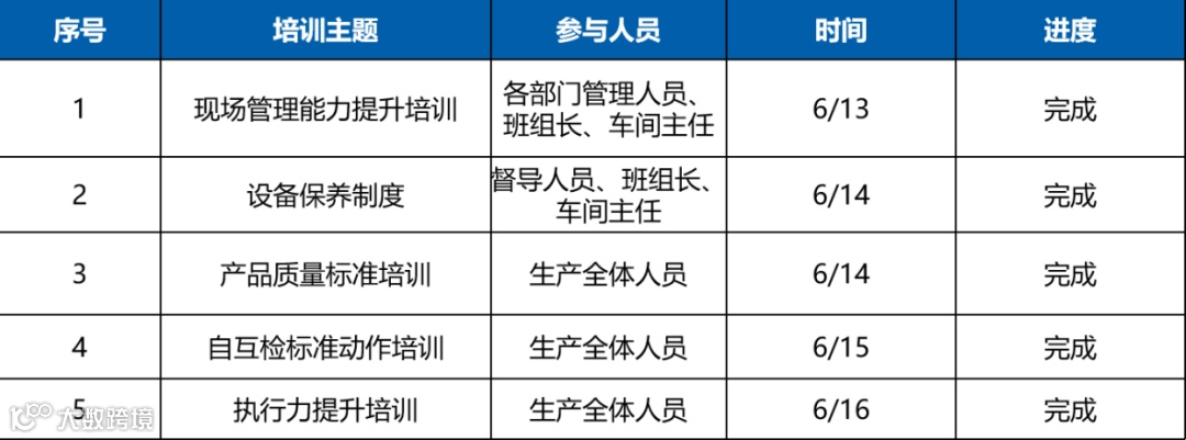 11. 通过早会宣传和讨论质量相关内容,对生产管理人员和员工进行质量和设备保养的培训。