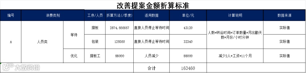 通过封边设备保养和质量改善,分捡工序和擦板工序各减少1名员工,节省了擦板和包装工序的浪费时间,价值换算年度总计节省成本163460元。