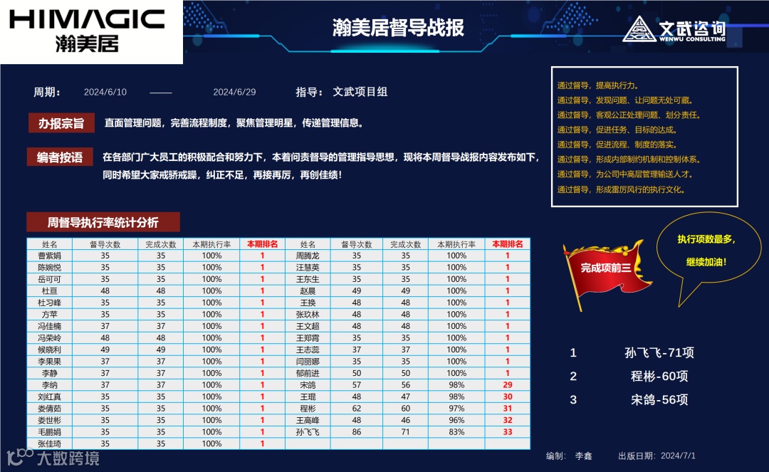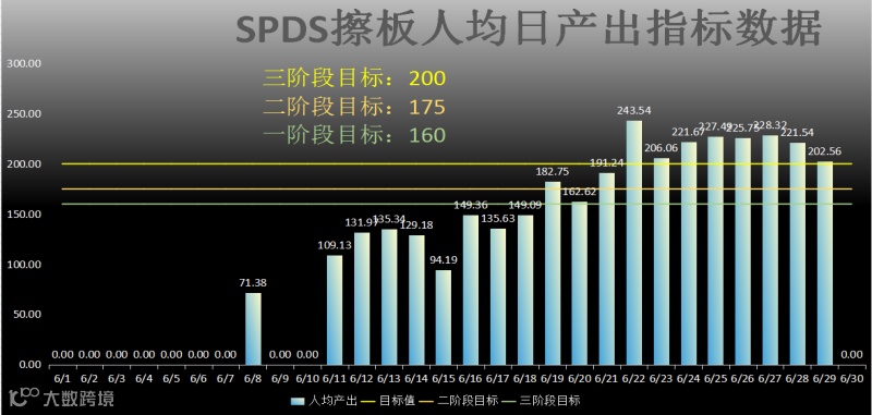 截至6月30日,擦板工序达到预期目标,封边质量提升75%,擦板效率提升30%。6月第三周人均产出比第一周增长23%,第四周比第一周增长32%。6月份工厂生产产量同比5月份增长32%。