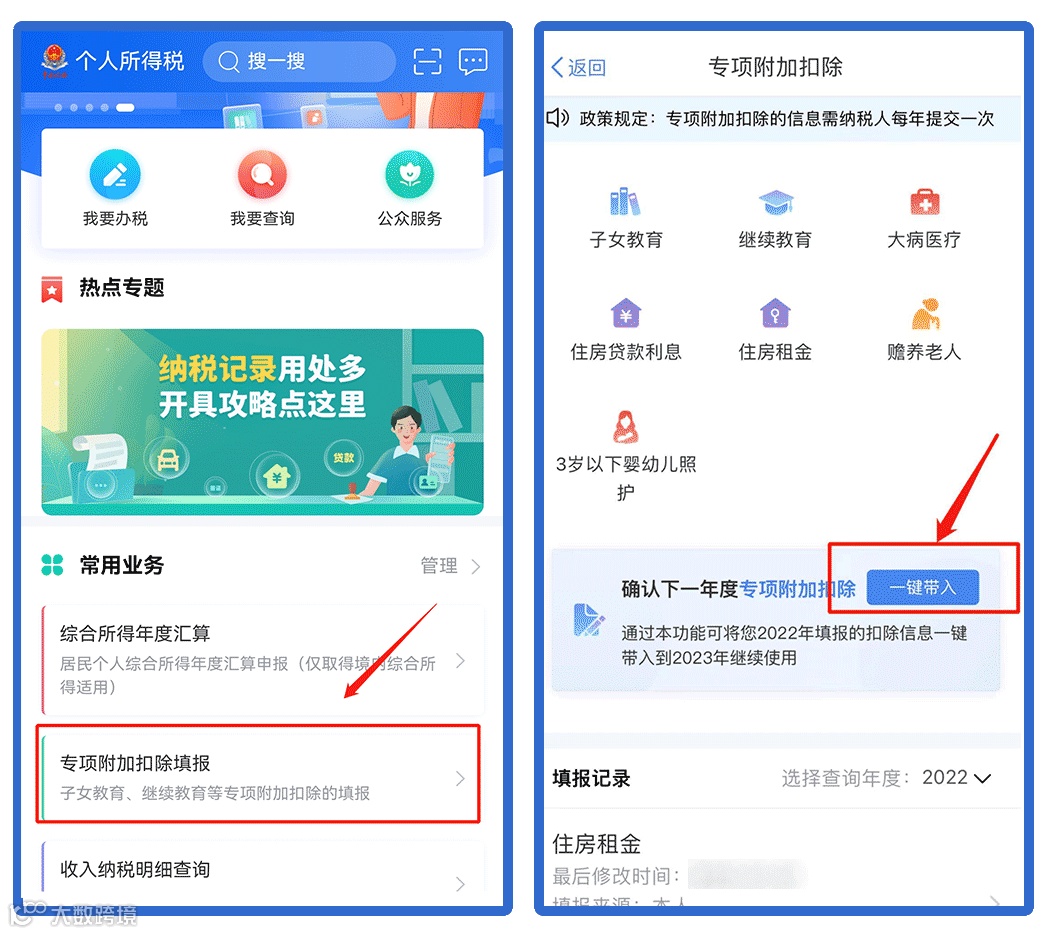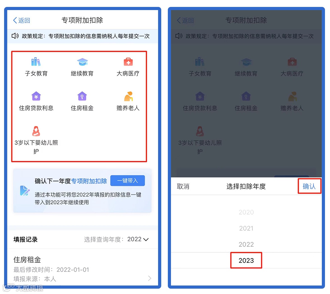 注意:扣除年度指可享受专项附加扣除的年度,每次只能选择一个年度。对于子女教育支出、赡养老人支出、房贷利息支出等连续多年的扣除需要每年重新填写或确认。