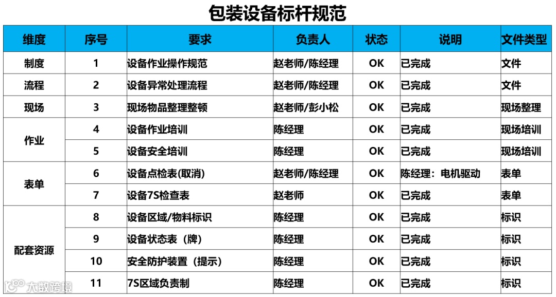 为完善设备管理文件,制定《设备作业指导书》《设备状态标识》《设备日点检计划》等规范;明确设备状态标识与清洁规范;落实物品定位;实现现场清洁与杂物规范摆放;指定 7S 负责人。