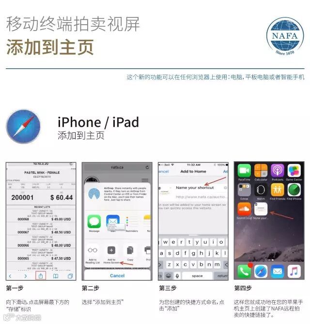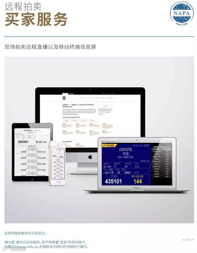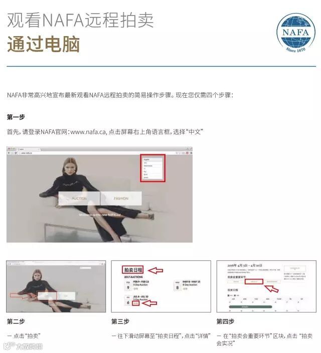 如想获取以上服务,您将不再需要登录您的帐号,只须访问本公司网站上的“2018年5月14日—5月21日”网页(http://www.nafa.ca/zh-hans/auction/may-14-21-2018/),选择“拍卖会实况”或者“移动终端拍卖视屏”即可。