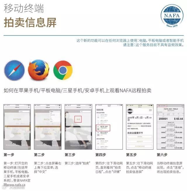 除了我们传统的拍卖实况直播以外,NAFA的移动终端拍卖视屏服务将让您从各种移动设备上(iPhone、iPad、Android)观看NAFA拍卖会。