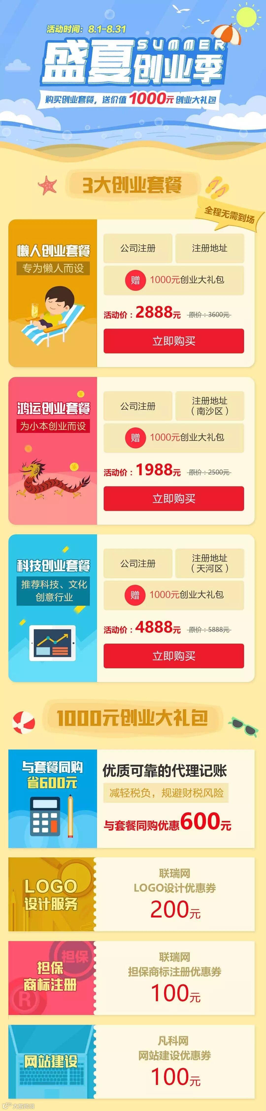 导读:夏日炎炎,正是一年创业好时节,第6天夏日创业季节,隆重推出3大优惠套餐,办理就送1000元创业大礼包!