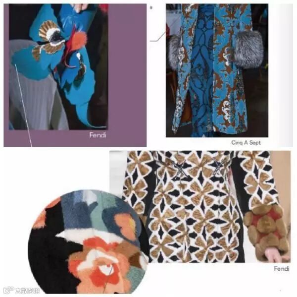 说到图案的纹样,就一定少不了Fendi,这件整身水貂嵌花设计,采用了传统建筑砖块般的几何形花朵,不过Fendi最擅长的还是切割花朵图案再拼接设计的方法呈现立体感变化。这款小巧的Fendi手拎包装饰着夸张的花朵,压花牛皮搭配皮草毛球,层次感丰富,