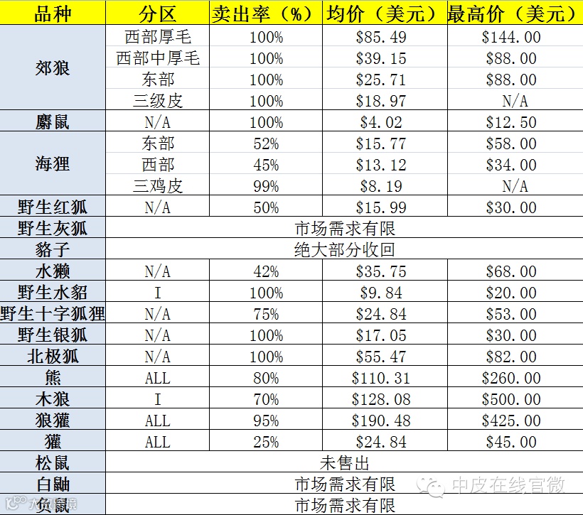 野生水貂数量较少,100%拍卖成功。大号海狸皮拍卖结果令人满意,但是小号尺寸海狸皮则遇到了市场阻力。由于俄罗斯市场需求低迷,绝大部分的貉子皮收回。出于同样原因,红狐、灰狐和农场饲养的银狐的拍卖结果也不尽如人意。