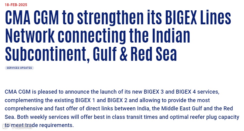 通过新增的BIGEX3和BIGEX4航线,达飞集团扩展了印度、海湾地区和红海之间最全面的直航服务,连接了印度与红海和阿拉伯湾上游地区。