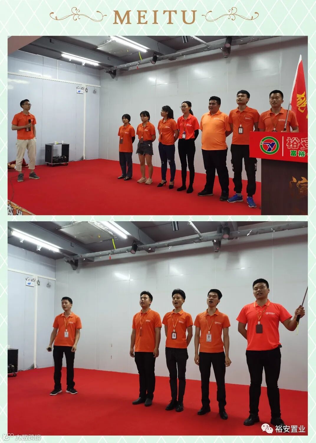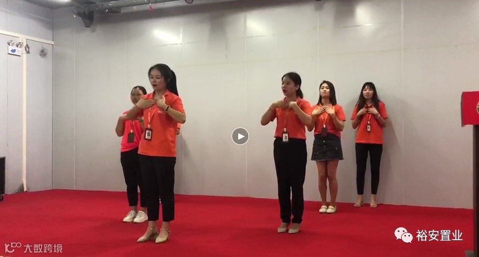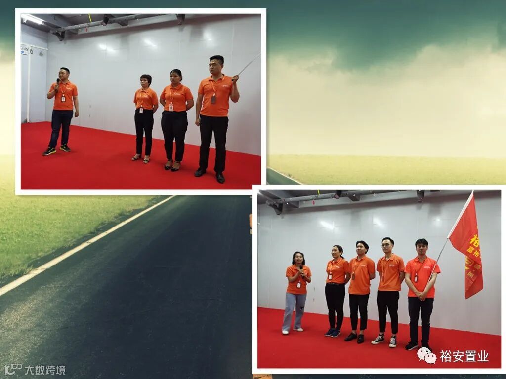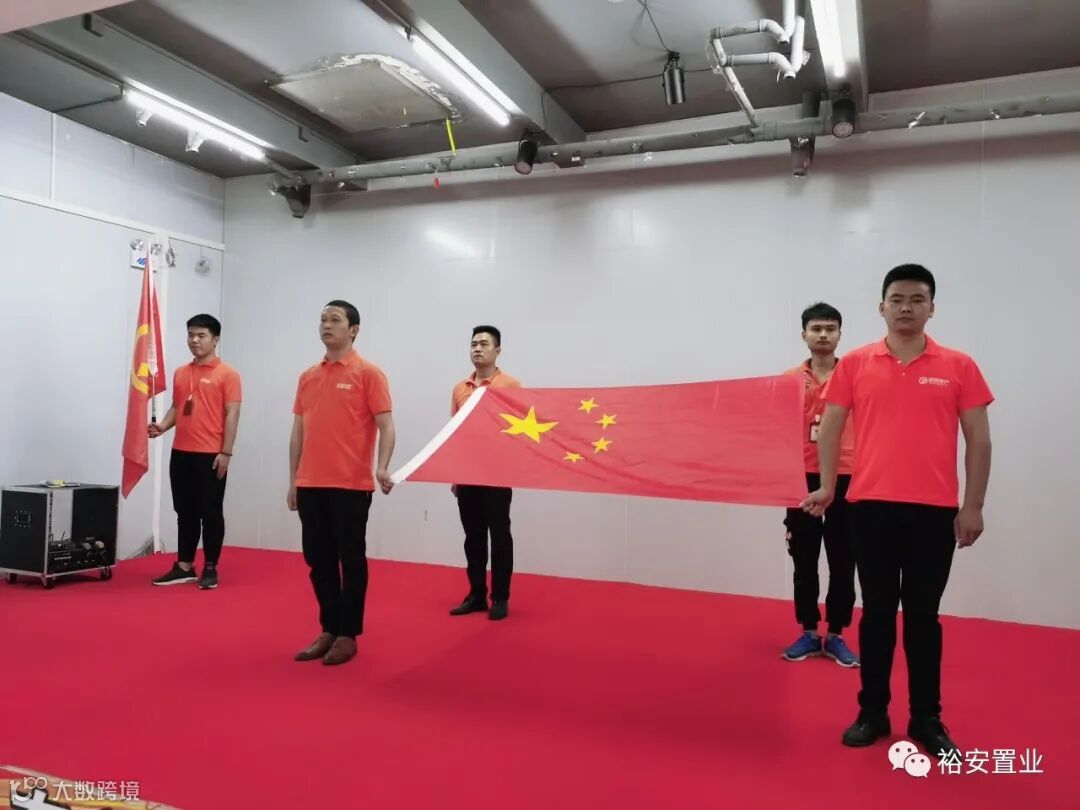 全体起立,掌上有请裕安护卫队!升旗奏司歌,全体行注目礼,让我们唱祖国歌!高声朗读公司的使命愿景。