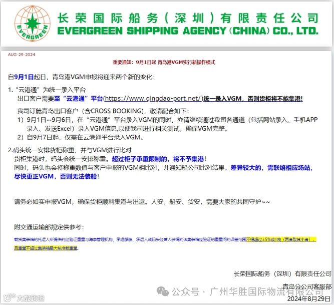 自9月1日起,所有出口客户需通过“云港通”平台(https://www.qingdao-port.net/)统一录入VGM信息。为确保过渡期的顺畅进行,长荣海运特别提醒: