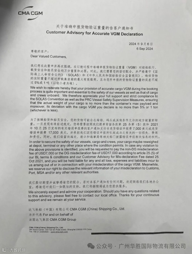 在《关于准确申报货物验证重量的告客户通知书》中,达飞表示,申报货物验证重量(VGM)需严格遵守《国际海上人命安全公约》(SOLAS)和《中华人民共和国船舶安全监督规则》,确保货物的实际重量不超过所载集装箱的最大有效载荷,且与您所申报的货物验证重量的误差不超过5%或1吨(以较小者为准)。