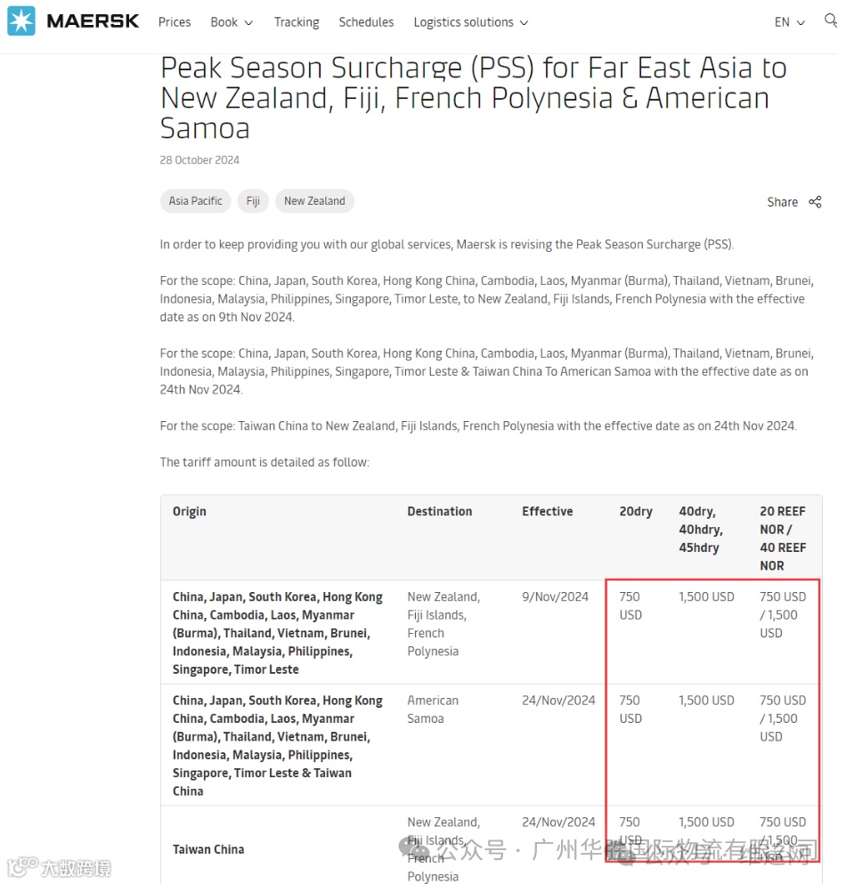 马士基调整征收远东到新西兰、斐济、法属波利尼西亚等旺季附加费PSS,2024年11月9日起生效。征收标准如下: