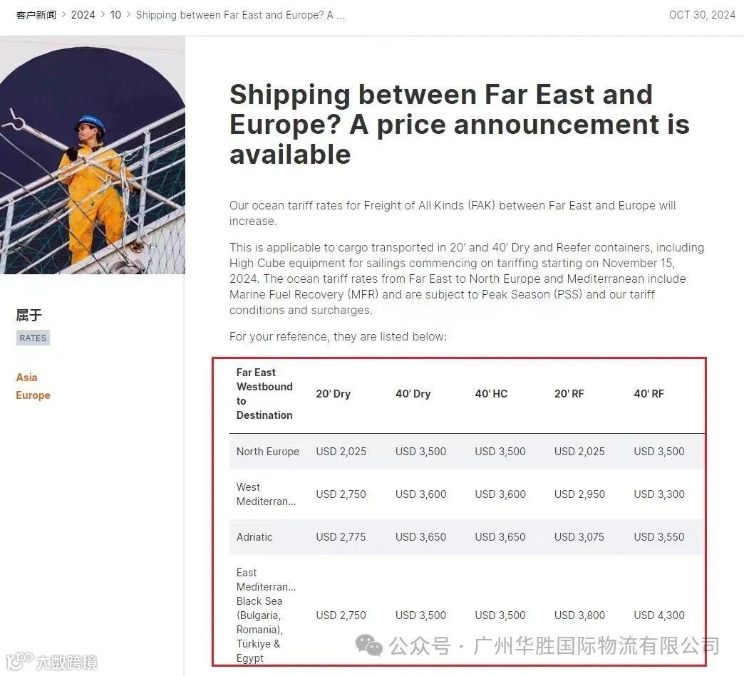 10月30日,赫伯罗特官网发布公告,将提高远东和欧洲之间的FAK费率。适用于20英尺和40英尺干集装箱和冷藏集装箱运输的货物,包括高箱。2024年11月15日开始生效。详情如下: