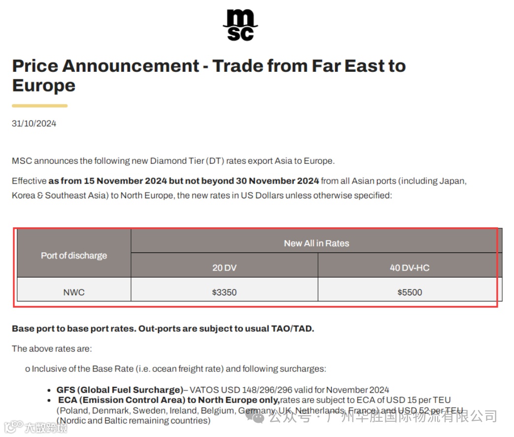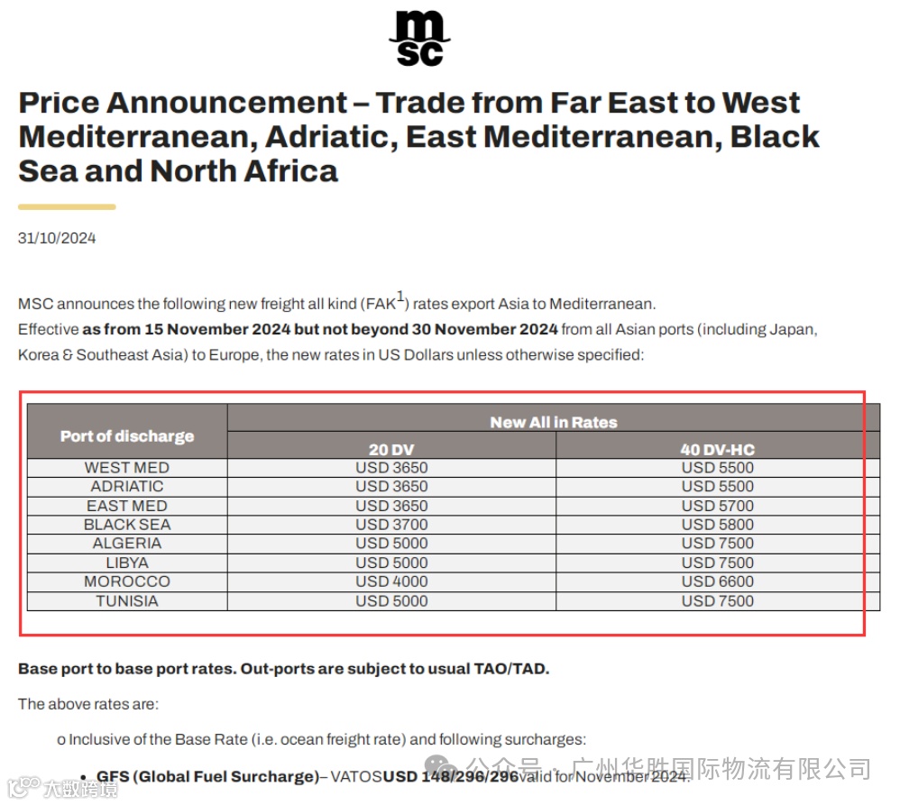 10月31日,MSC地中海航运发布最新公告,将调整从远东到欧洲、地中海、北非的运费标准,自2024年11月15日起生效。