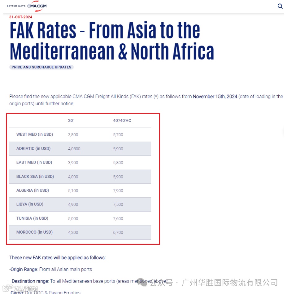 10月31日CMA发布公告,从2024年11月15日(装货日期)开始至另行通知,从亚洲到地中海和北非适用新的FAK费率,详情如下: