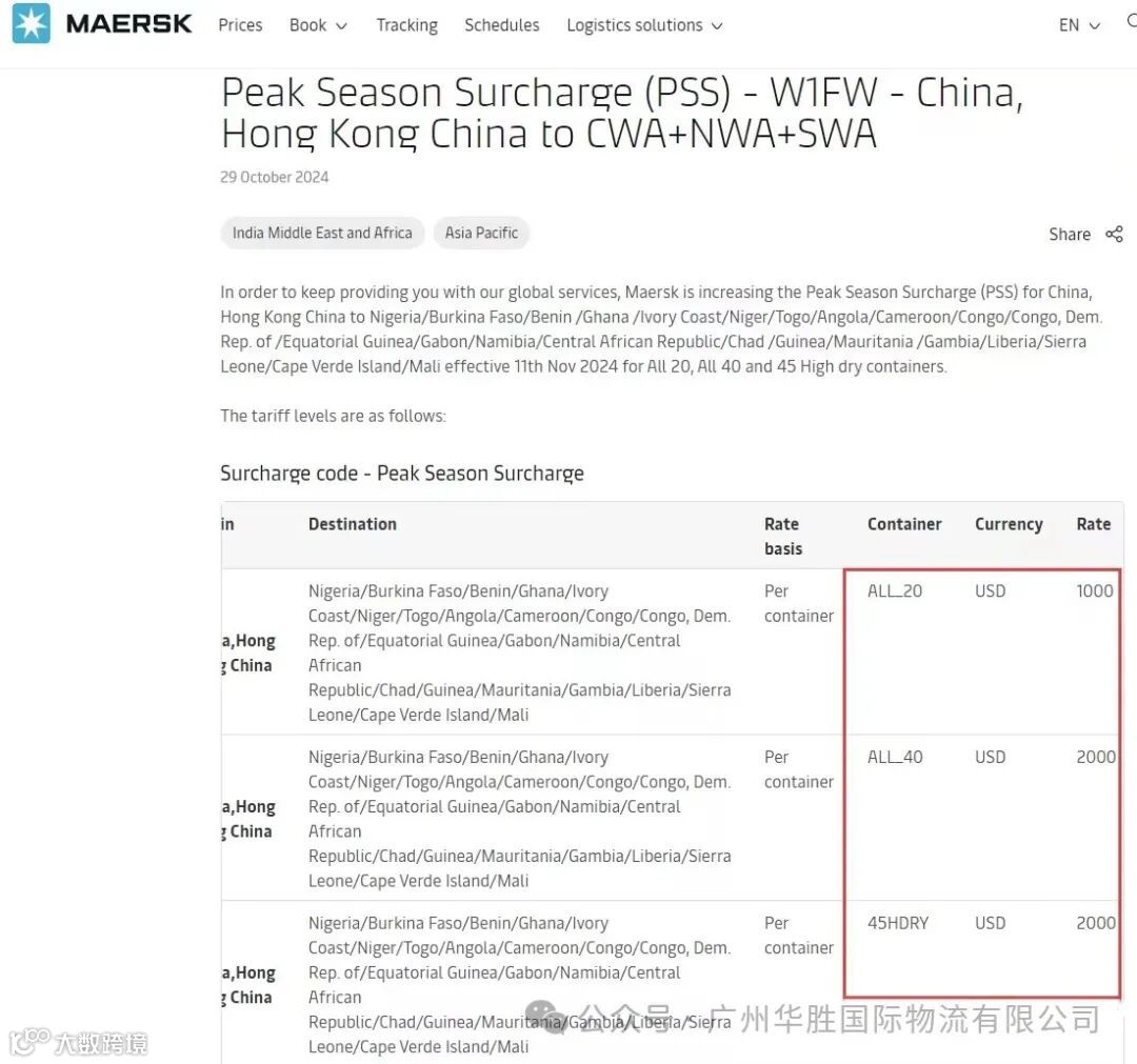马士基将提高中国、中国香港至尼日利亚/布基纳法索/贝宁/加纳/科特迪瓦/尼日尔/多哥/安哥拉/喀麦隆/刚果/刚果、赤道几内亚/加蓬/纳米比亚/中非共和国/乍得/几内亚/毛里塔尼亚/冈比亚/利比里亚/塞拉利昂/佛得角岛/马里的旺季附加费(PSS),自2024年11月11日起生效。所有20英尺、40英尺和45英尺高箱。征收标准如下: