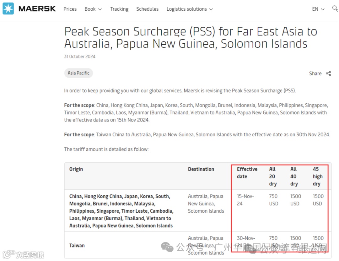 马士基调整征收远东至澳大利亚、巴布亚新几内亚、所罗门群岛旺季附加费PSS,2024年11月15日起生效。征收标准如下: