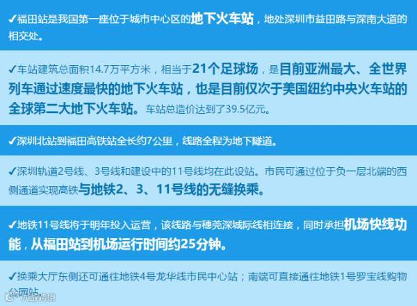 这个将要通车的福田站,可不一般!它可是亚洲最大的地下火车站,车站及相关工程全长11.4公里,为地下三层,设8线4站台21个出入口,以及12个消防疏散口,总建筑面积达14.7万平方米,相当于21个标准足球场的大小,站总造价约39.5亿元。