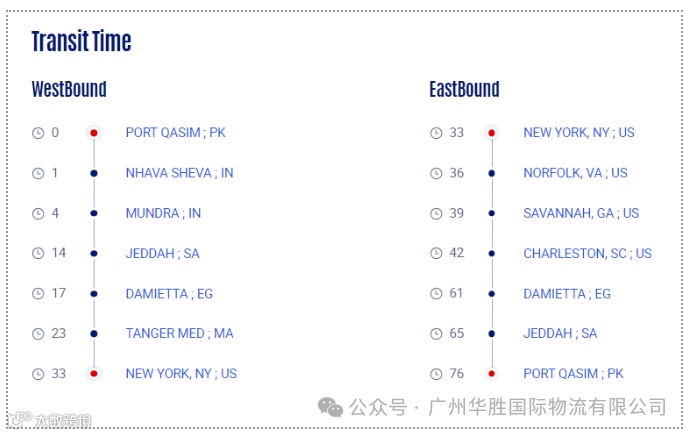 计划中,该航线将部署11艘容量在8500至9950标箱之间的船舶,按如下顺序挂靠各大港口:卡西姆港、那瓦舍瓦、蒙德拉、吉达、达米埃塔、丹吉尔港(仅西行挂靠)、纽约、诺福克、萨凡纳、查尔斯顿,最后再返回达米埃塔、吉达,直至回到起点卡西姆港。