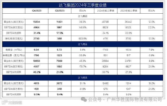 2024年第三季度,达飞集团实现总营业收入158.3亿美元,同比增长38.5%;息税折旧摊销前利润达到49.6亿美元,同比增长148.6%;EBITDA利润率同比增长13.9个百分点至31.4%;集团净利润达到27.3亿美元,较上年同期增加23.4亿美元或增长603.6%。