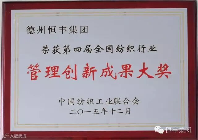 12月11日上午,以“新起点 新跨越”为主题的“2015中国纺织创新年会"在北京隆重召开,德州恒丰集团理事长苏建军应邀参会。大会对第四届“全国纺织行业管理创新成果奖”获奖企业进行颁奖,苏建军上台领奖。