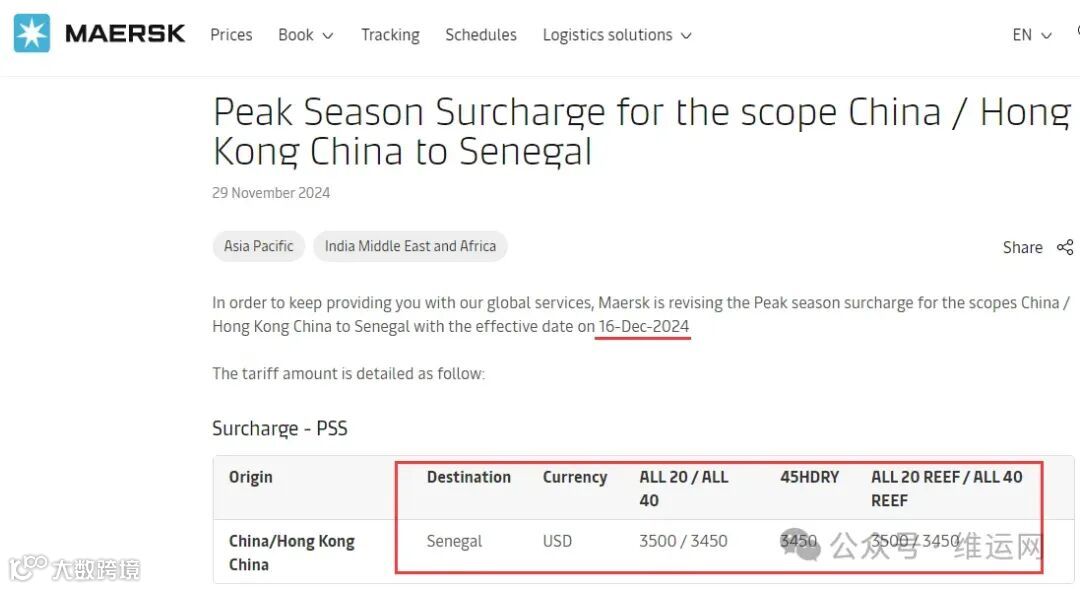马士基征收中国、中国香港至塞内加尔旺季附加费PSS