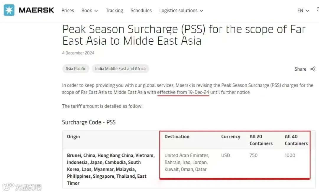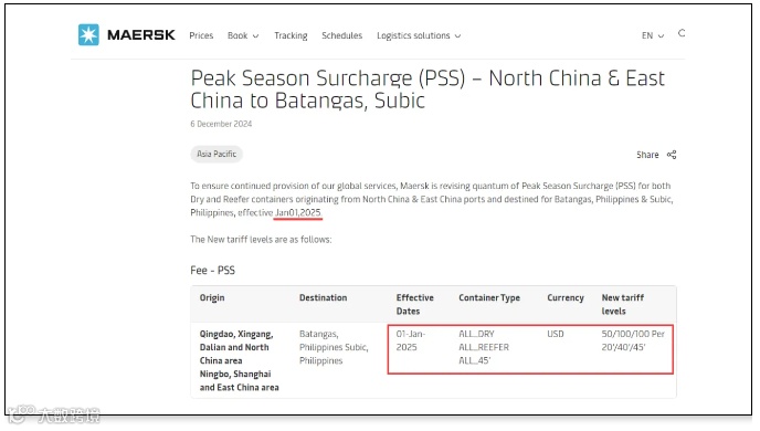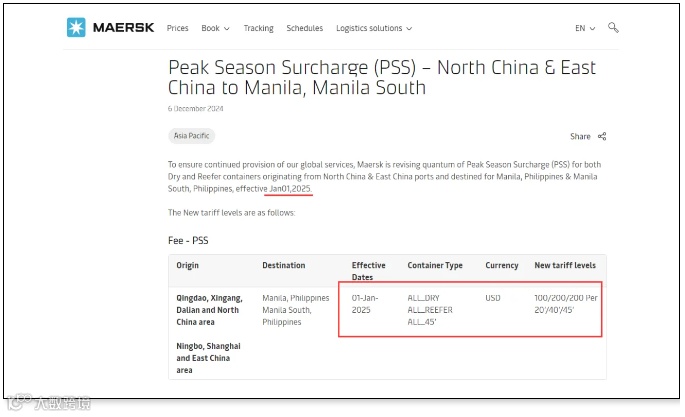 为确保持续提供全球服务,马士基正在调整从华北和华东港口出发,目的地为菲律宾马尼拉的干货和冷藏集装箱的旺季附加费(PSS),自2025年1月1日起生效。征收标准详情如下: