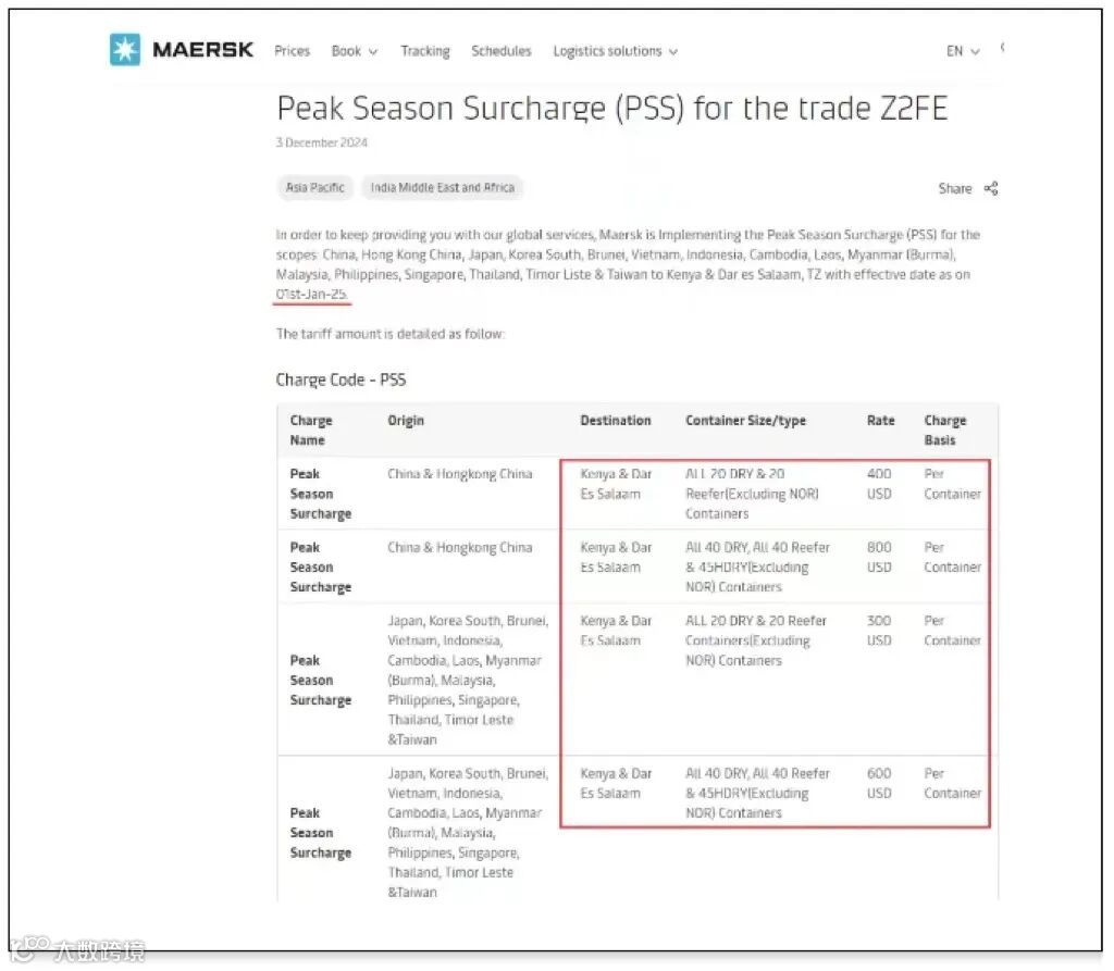 马士基征收中国、中国香港等至肯尼亚和达累斯萨拉姆旺季附加费PSS