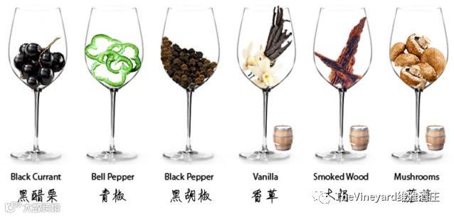 黑加仑、黑醋栗、黑樱桃、青椒、薄荷;烟熏、香草、雪松等橡木带来的风味;陈年之后还会有菌菇类、干树叶、甘草、动物皮革味和矿物香气。