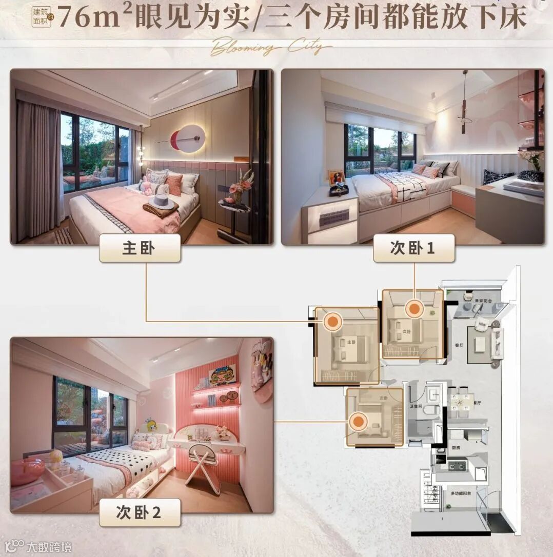 ·建面约76㎡山景3房+1空间:景观三开间布局,客厅和主次卧均可平等分享自然的馈赠,站在窗前,岐山公园的巨幕山景近收眼底,这般美景,丝毫不逊色于鼎豪。