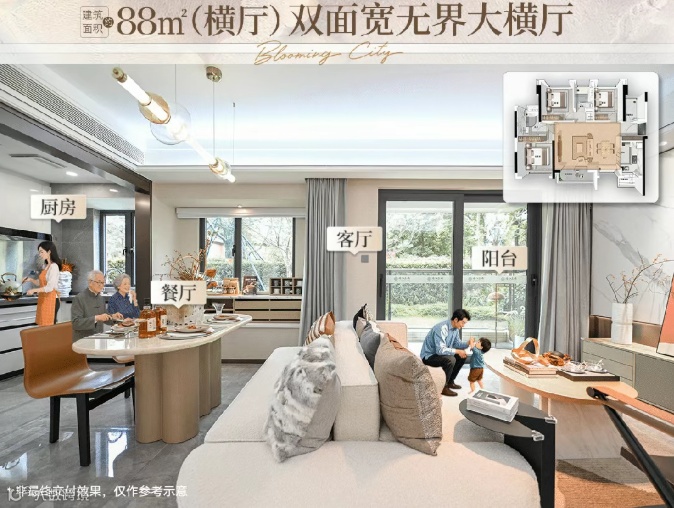 ·建面约88㎡横厅户型:天河市场罕有正南朝向户型,推窗尽览【公园里】园林盛景,四季风光流转,成为家的背景画。