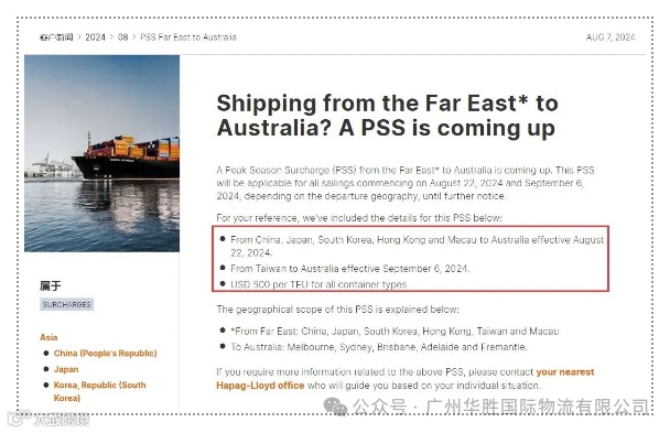 近日赫伯罗特还宣布,2024年8月22日起,从远东到澳大利亚的所有集装箱货物征收旺季附加费(PSS),直至另行通知。