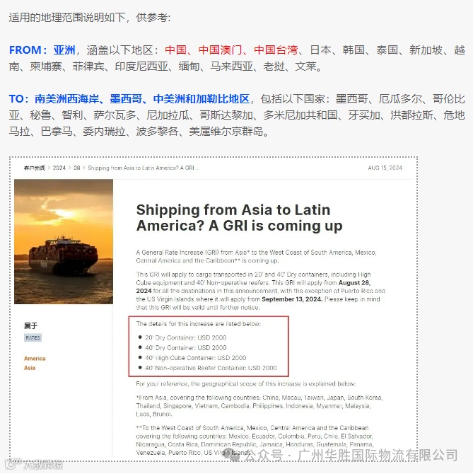 赫伯罗特日前在其官方网站上正式发布公告,宣布自2024年8月28日起,将对从亚洲运往南美洲西海岸、墨西哥、中美洲及加勒比海地区的海运货物实行综合费率上涨附加费(GRI),该调整将持续有效直至另行通知。