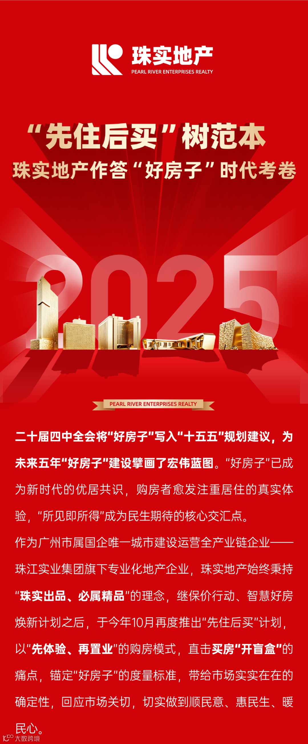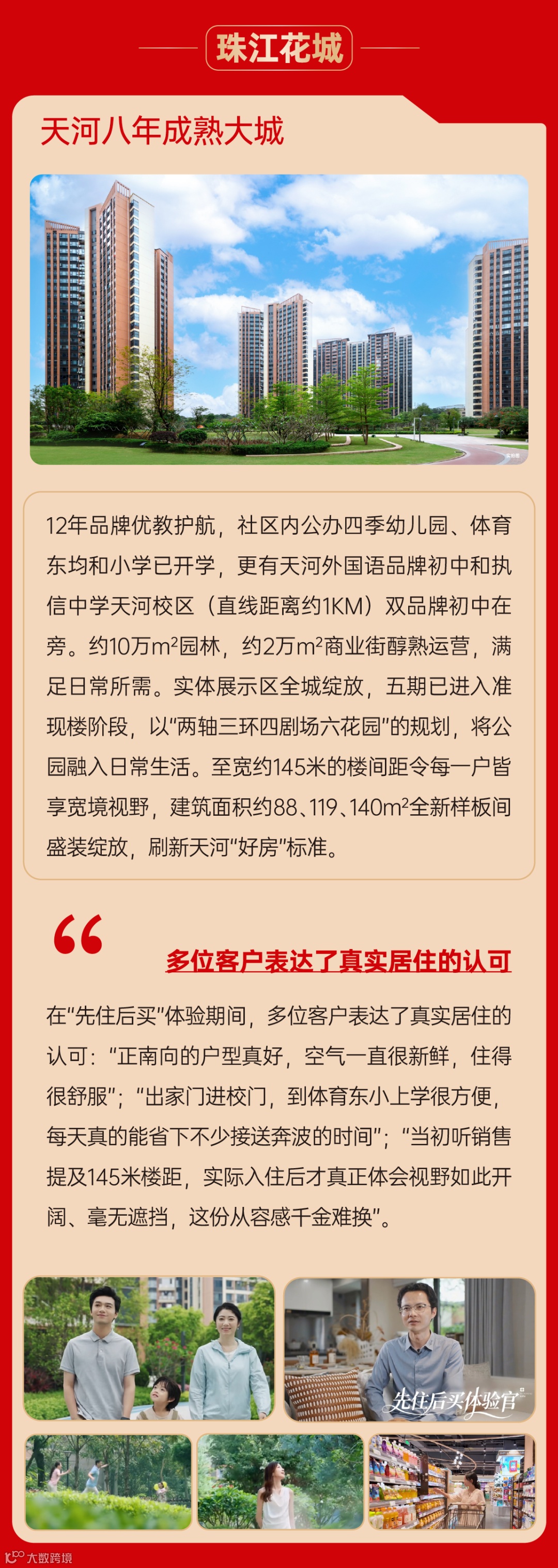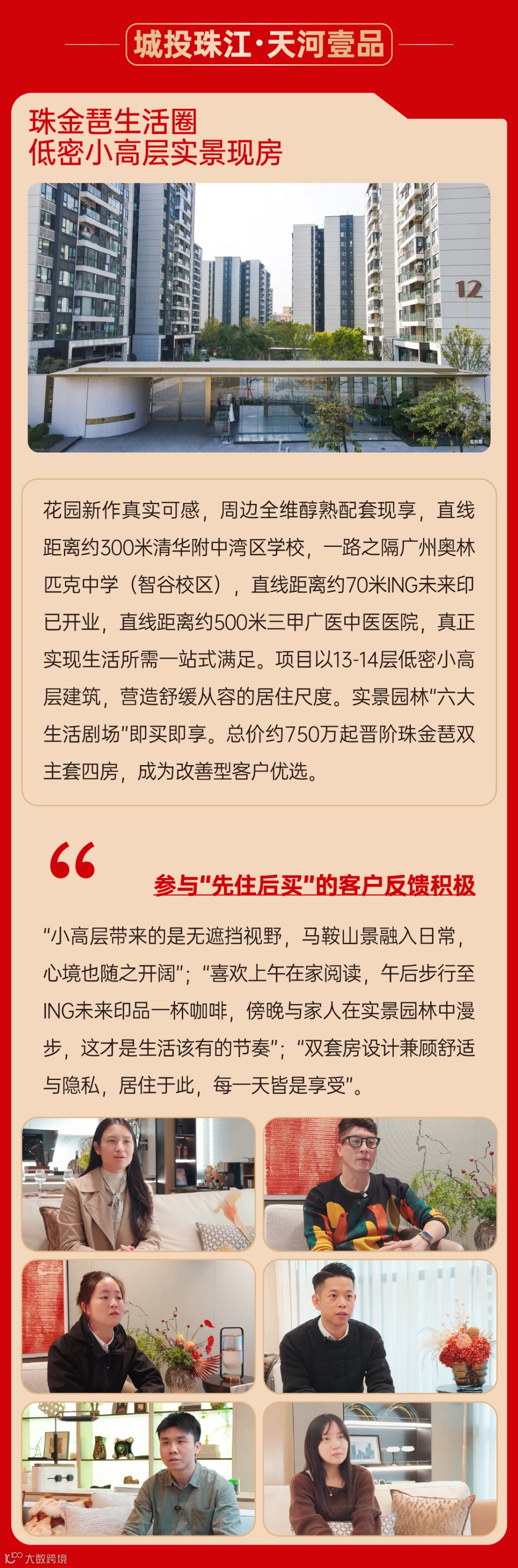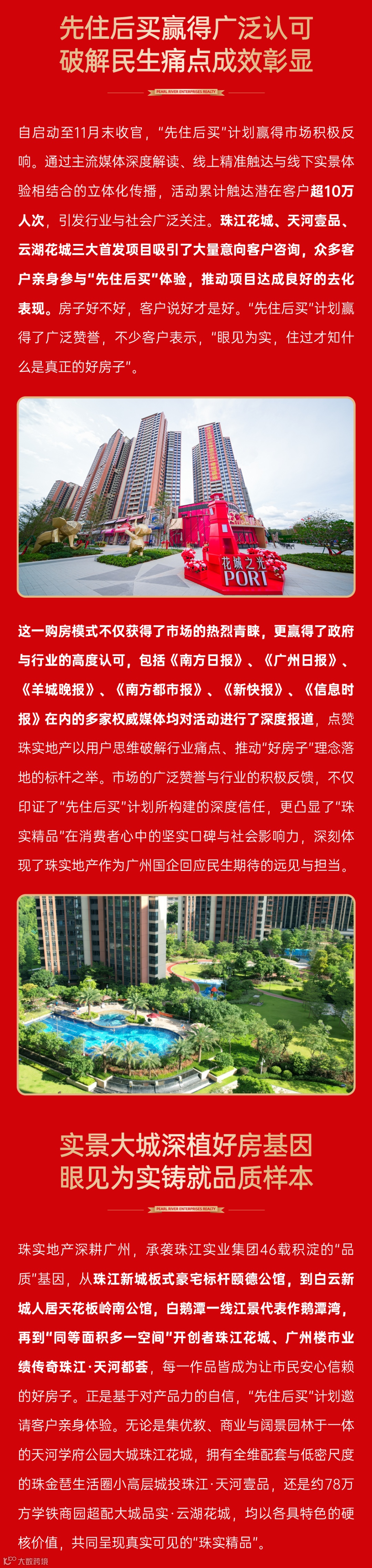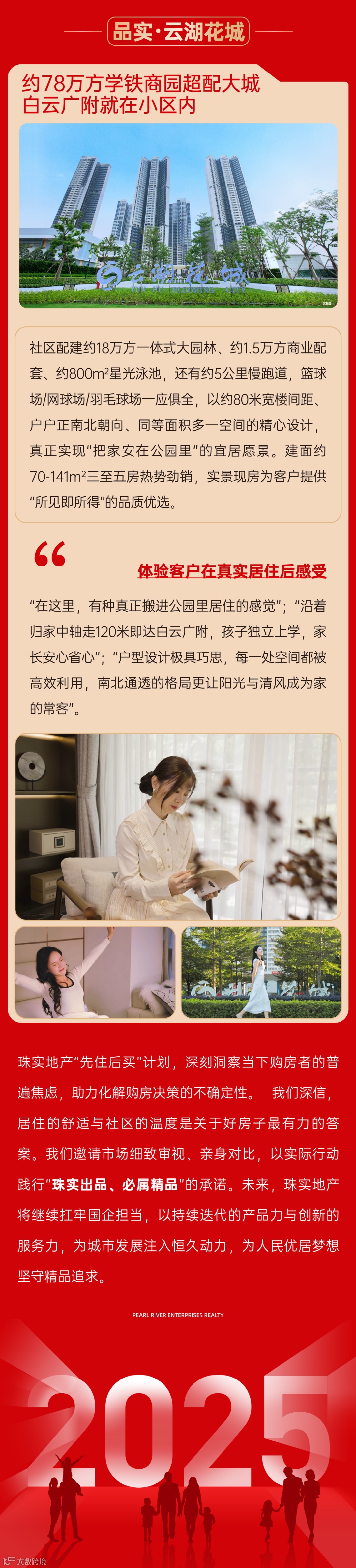 免责声明:1、本宣传资料仅为要约邀请,所有文字和图片仅供参考,不作为开发商的销售承诺及要约内容,买卖双方权利义务均以实际签订的商品房合同约定为准。2、先住后买先住后买活动限珠江花城、天河壹品、云湖花城项目的指定现房房源参与,“先住”房源为指定房源,与客户最终意向房源可能不同。因客户个人选择退出“先住后买”计划,需按所签协议承担相应房屋占用费。具体细则以双方签订的书面协议为准。3、本活动宣传推广细则以各楼盘现场执行政策为准。画面中涉及先住后买内容、优惠活动等以各楼盘现场输出为准。4、成交/活动礼品领取以各楼盘现场实物及政策为准,数量有限,领完即止。奖金池数量有限,先到先得,送完即止。开发商保留对宣传资料更新、修改的权利,敬请留意最新宣传资料。5、本宣传资料对周边环境、政府规划、商业配套、教育资源、地铁、城轨、高速、投资前景等信息为截止于2025年12月的情况,有关介绍仅为提供相关信息,并不作为开发商的销售承诺和要约内容,前述信息可能因政府规划调整及开发商无法控制、预测原因而出现变化,以最新公布的政府文件及相关官方信息为准。6、本宣传资料对项目周边幼儿园、学校等教育配套资源的介绍旨在提供相关信息,并不意味着本公司对就学安排做出承诺。教育资源的名称、办学性质、办学规模、学位位置、开学(班)时间、招生条件、收费标准及招生区域存在调整的可能,应以教育主管部门及办学方颁布的政策规定为准。7、本宣传资料解释权,在相关法律范围内归广州珠实地产有限公司及旗下项目开发商所有。珠江花城:珠江花城:穗房预(网)字第20211554、20220238、20220678、20230264、20230263、20230249、20220677、20230419号;城投珠江·天河壹品:穗房预(网)字第20230301号;品实·云湖花城:穗房预(网)字第20200495号。