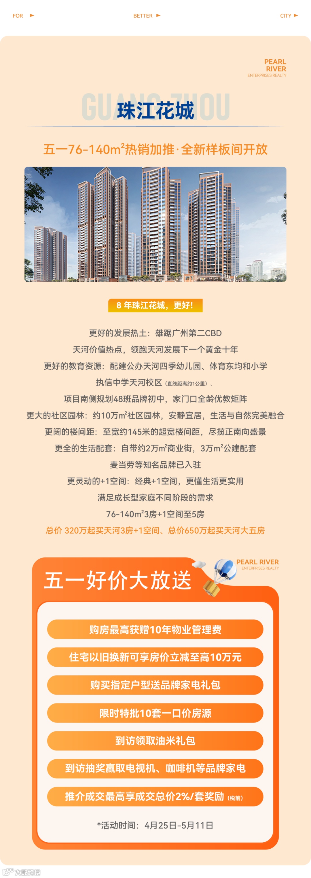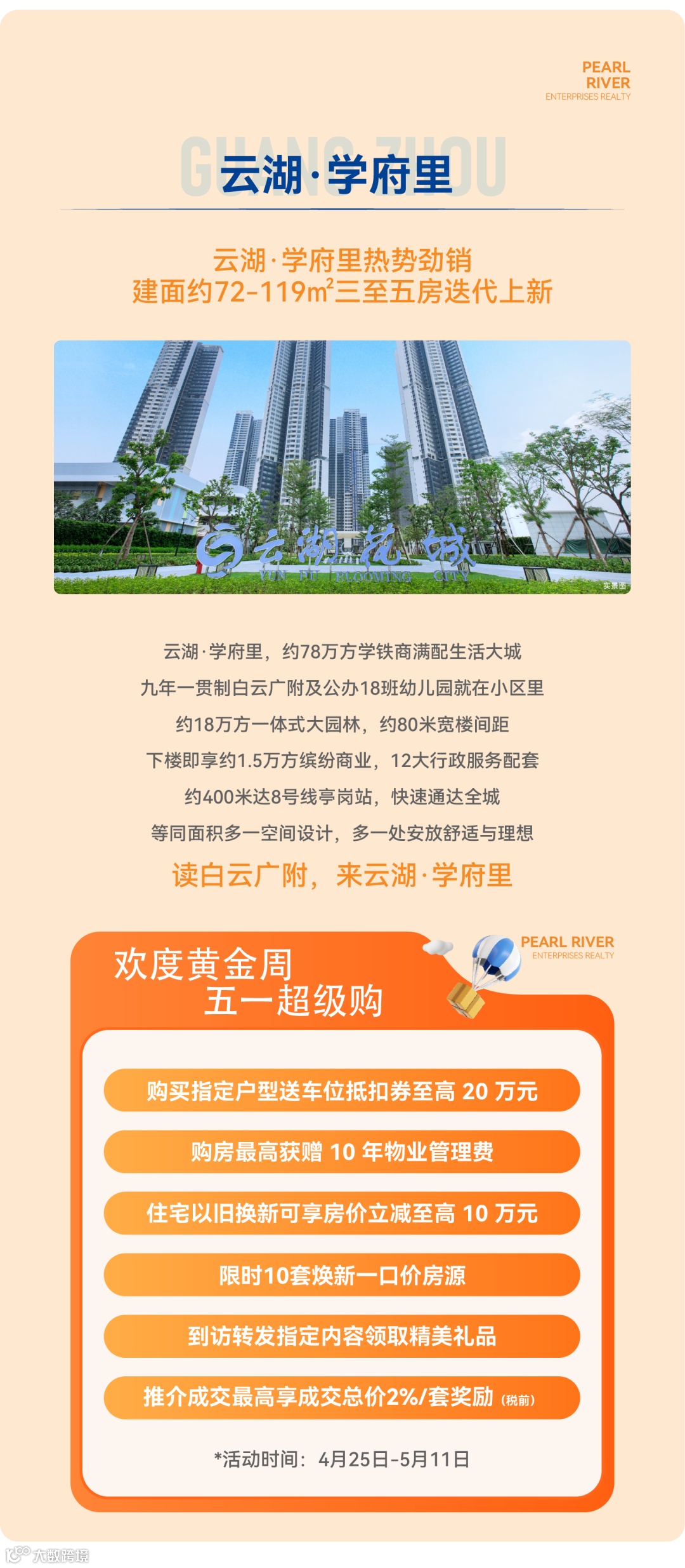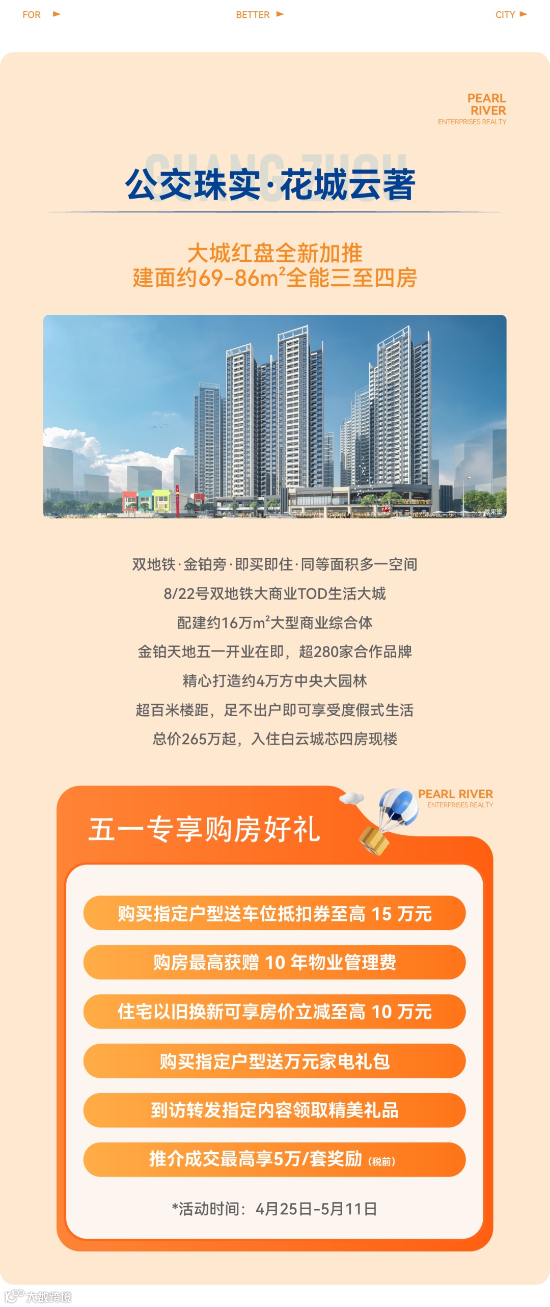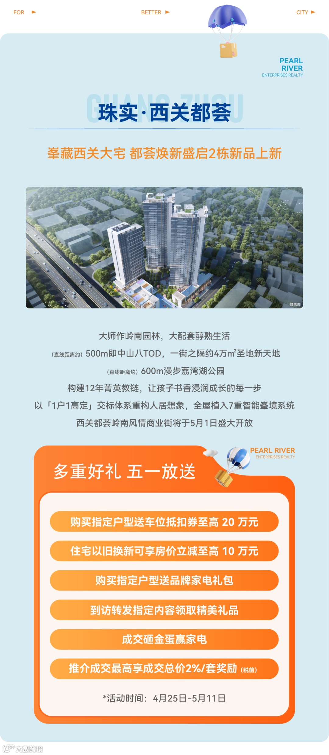 免责声明:1、本宣传资料仅为要约邀请 ,所有文字和图片仅供参考,不作为开发商的销售承诺及要约内容,买卖双方权利义务均以实际签订的商品房合同约定为准。2、本宣传资料对周边环境、政府规划、商业配套、教育资源、地铁、城轨、高速、投资前景等信息为截止于2025年4月的情况,有关介绍仅为提供相关信息,并不作为开发商的销售承诺和要约内容,前述信息可能因政府规划调整及开发商无法控制、预测原因而出现变化,以最新公布的政府文件及相关官方信息为准。3、本宣传资料对项目周边幼儿园、学校等教育配套资源的介绍旨在提供相关信息,并不意味着本公司对就学安排做出承诺。教育资源的名称、办学性质、办学规模、学位位置、开学(班)时间、招生条件、收费标准及招生区域存在调整的可能,应以教育主管部门及办学方颁布的政策规定为准。4、部分图片来源网络,如有侵权,请联系删除。5、本活动宣传推广细则/期限以各楼盘现场执行政策为准。画面中涉及折扣优惠等以各楼盘现场公示为准。全民营销具体政策/期限/提取方式等以各楼盘现场执行政策为准。到访/成交礼品/活动礼品领取以各楼盘现场实物及政策为准,数量有限,领完即止。奖金池规模及数量有限,先到先得,领完即止。开发商保留对宣传资料更新、修改的权利,敬请留意最新宣传资料。6.本宣传资料解释权,在相关法律范围内归广州珠实地产有限公司及旗下项目开发商所有。宣传资料制作时间:2025年4月。