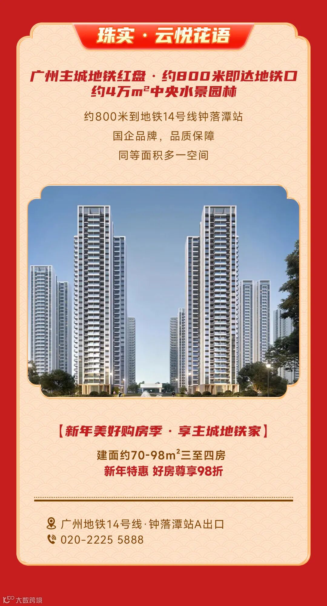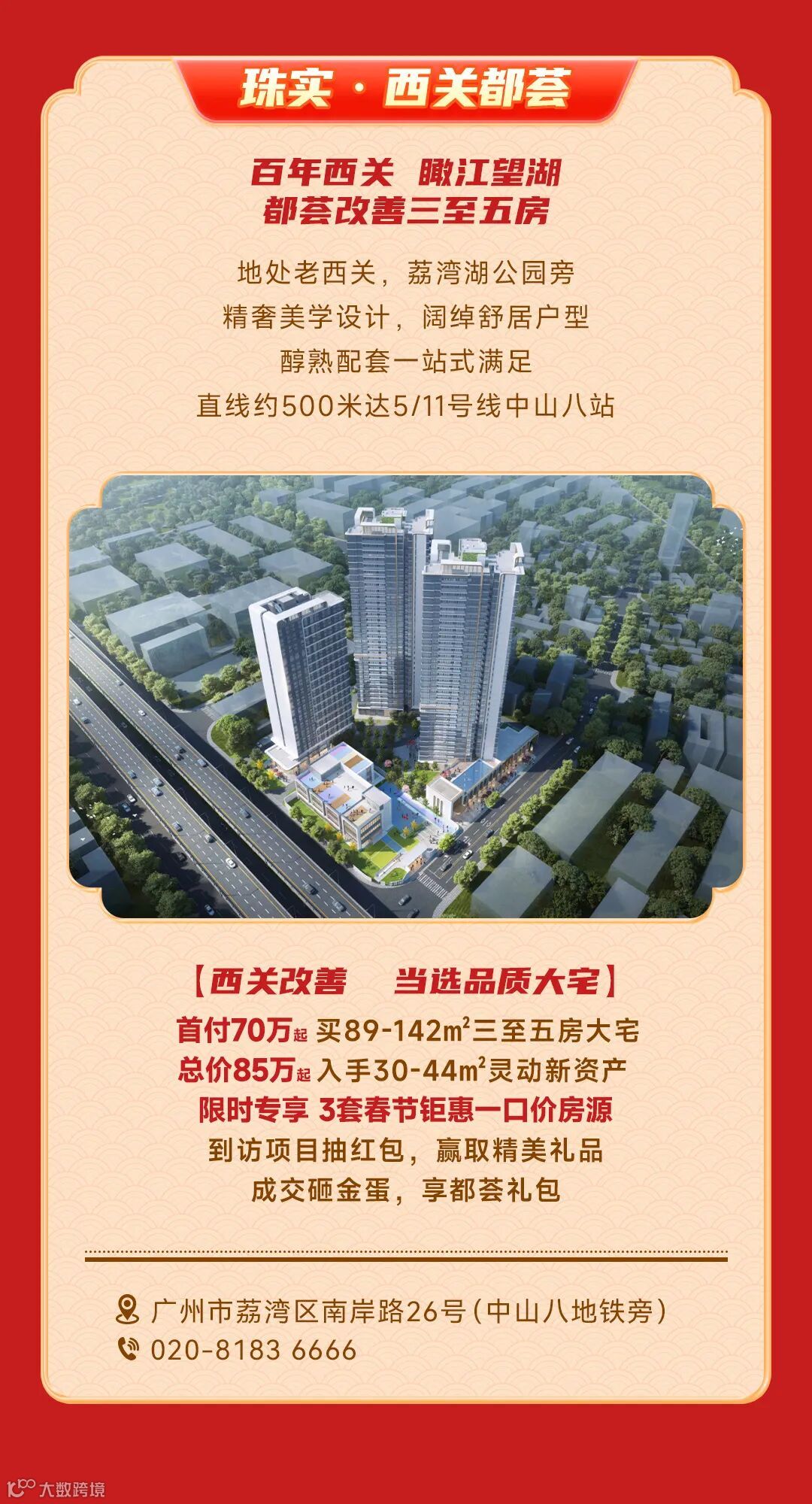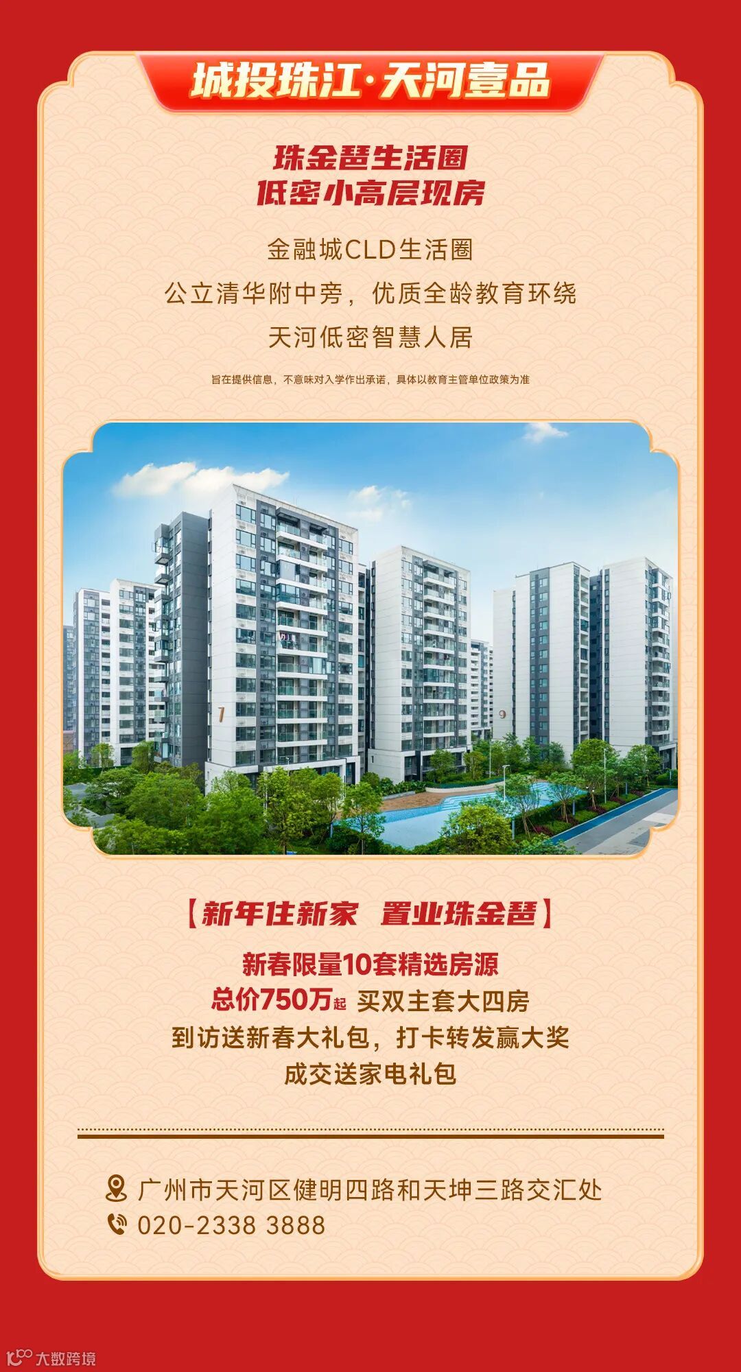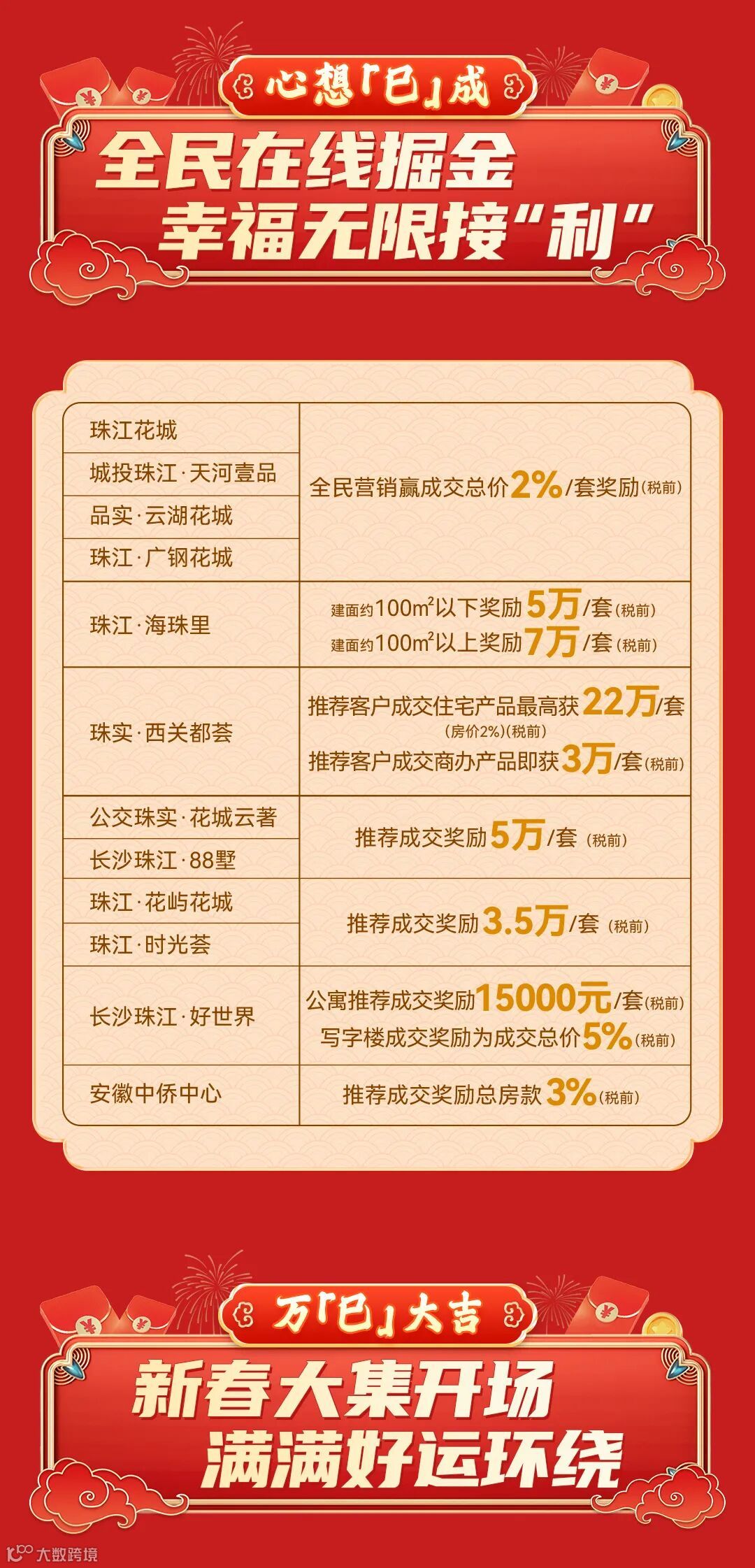 免责声明:1、本宣传资料仅为要约邀请 ,所有文字和图片仅供参考,不作为开发商的销售承诺及要约内容,买卖双方权利义务均以实际签订的商品房合同约定为准。2、本宣传资料对周边环境、政府规划、商业配套、教育资源、地铁、城轨、高速、投资前景等信息为截止于2025年1月的情况,有关介绍仅为提供相关信息,并不作为开发商的销售承诺和要约内容,前述信息可能因政府规划调整及开发商无法控制、预测原因而出现变化,以最新公布的政府文件及相关官方信息为准。3、本宣传资料对项目周边幼儿园、学校等教育配套资源的介绍旨在提供相关信息,并不意味着本公司对就学安排做出承诺。教育 资源的名称、办学性质、办学规模、学位位置、开学(班)时间、招 生条件、收费标准、及招生区域存在调整的可能,应以教育主管部门及办学方颁布的政策规定为准。4、部分图片来源网络,如有侵权,请联系删除。5、本活动宣传推广细则以各楼盘现场执行政策为准。画面中涉及折扣优惠等以各楼盘现场公示为准。全民营销具体政策/期限/提取方式等以各楼盘现场执行政策为准。到访/成交礼品/活动礼品领取以各楼盘现场实物及政策为准,数量有限,领完即止。奖金池规模及数量有限,先到先得,领完即止。开发商保留对宣传资料更新、修改的权利,敬请留意最新宣传资料。6.本宣传资料解释权,在相关法律范围内归广州珠实地产有限公司及旗下项目开发商所有。宣传资料制作时间:2025年1月。