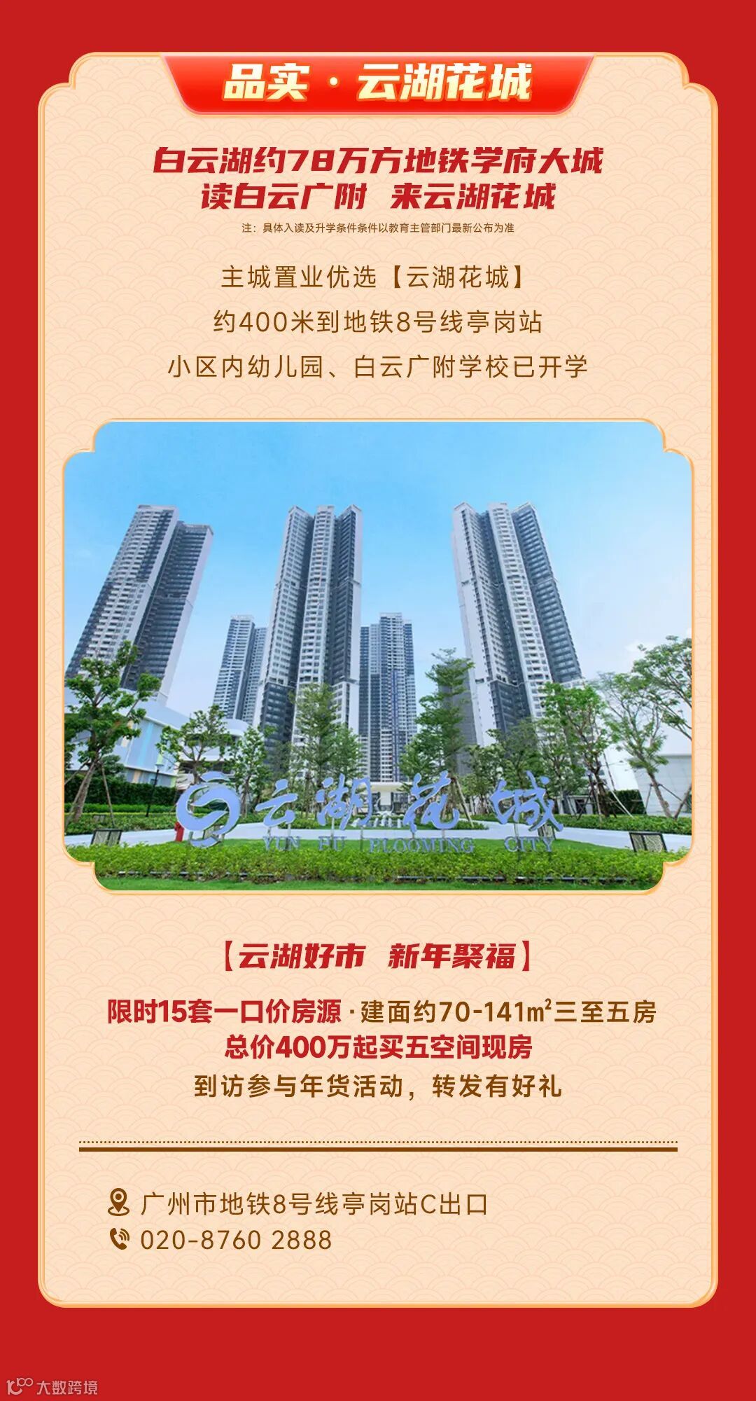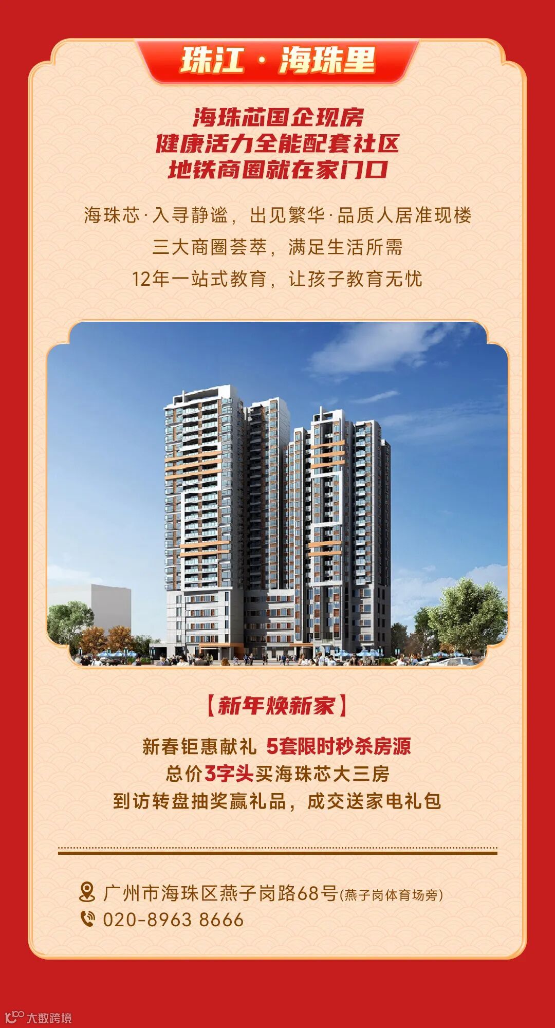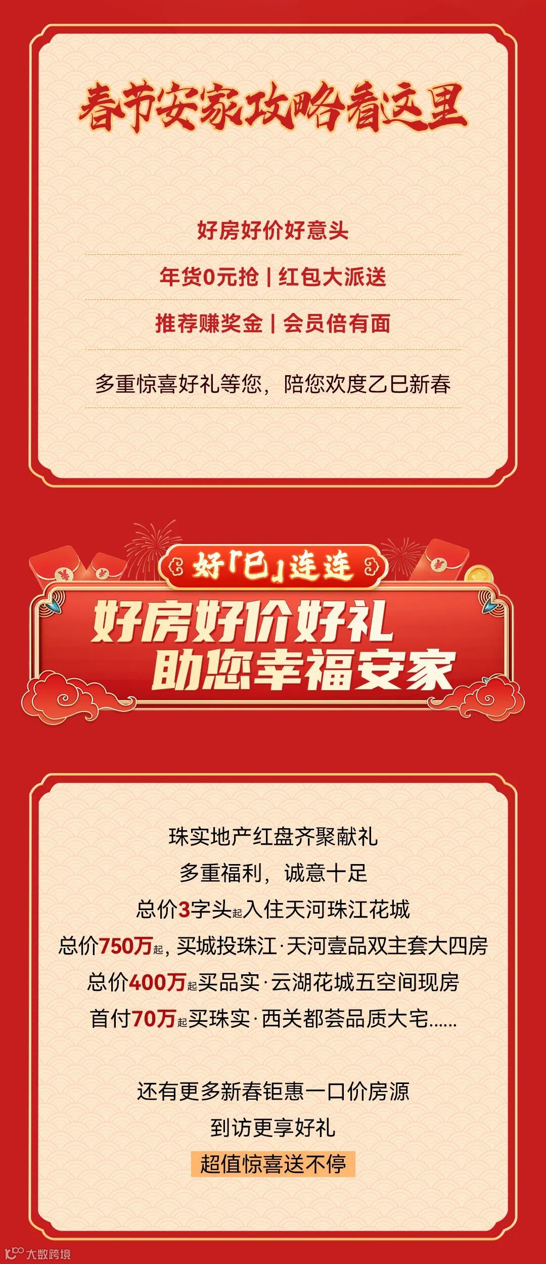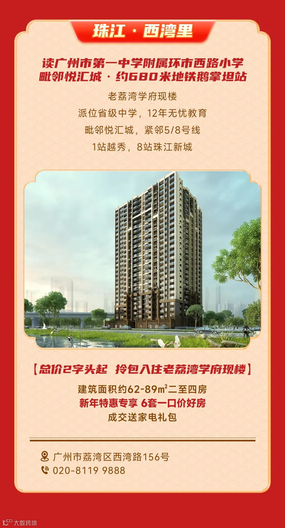免责声明:1、本宣传资料仅为要约邀请 ,所有文字和图片仅供参考,不作为开发商的销售承诺及要约内容,买卖双方权利义务均以实际签订的商品房合同约定为准。2、本宣传资料对周边环境、政府规划、商业配套、教育资源、地铁、城轨、高速、投资前景等信息为截止于2025年1月的情况,有关介绍仅为提供相关信息,并不作为开发商的销售承诺和要约内容,前述信息可能因政府规划调整及开发商无法控制、预测原因而出现变化,以最新公布的政府文件及相关官方信息为准。3、本宣传资料对项目周边幼儿园、学校等教育配套资源的介绍旨在提供相关信息,并不意味着本公司对就学安排做出承诺。教育 资源的名称、办学性质、办学规模、学位位置、开学(班)时间、招 生条件、收费标准、及招生区域存在调整的可能,应以教育主管部门及办学方颁布的政策规定为准。4、部分图片来源网络,如有侵权,请联系删除。5、本活动宣传推广细则以各楼盘现场执行政策为准。画面中涉及折扣优惠等以各楼盘现场公示为准。全民营销具体政策/期限/提取方式等以各楼盘现场执行政策为准。到访/成交礼品/活动礼品领取以各楼盘现场实物及政策为准,数量有限,领完即止。奖金池规模及数量有限,先到先得,领完即止。开发商保留对宣传资料更新、修改的权利,敬请留意最新宣传资料。6.本宣传资料解释权,在相关法律范围内归广州珠实地产有限公司及旗下项目开发商所有。宣传资料制作时间:2025年1月。