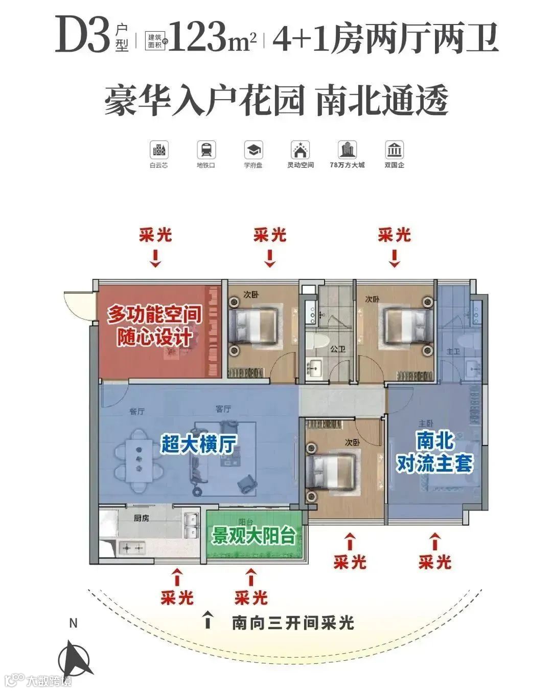 双阳台格局,让生活更添彩。南北通透格局,清风穿堂而过,拒绝封闭沉闷。