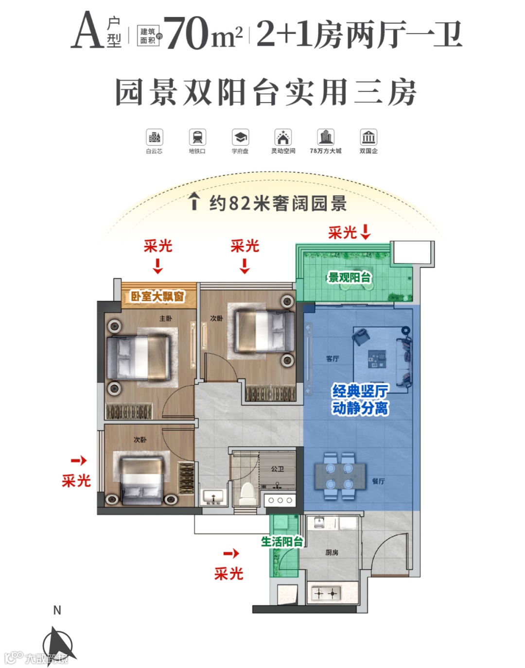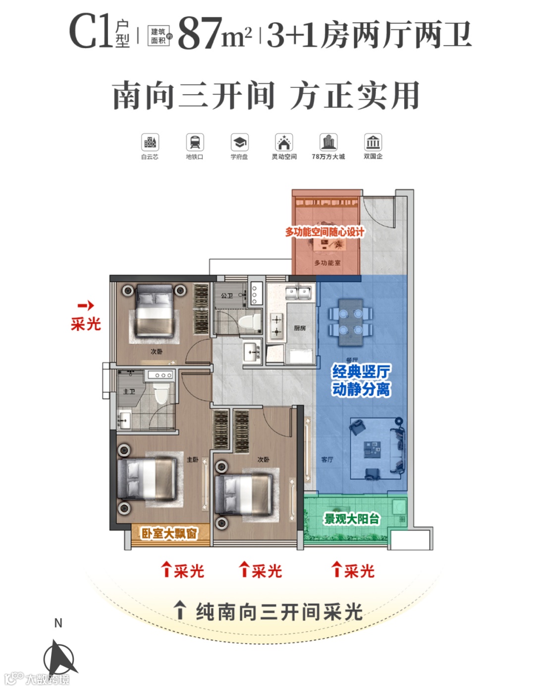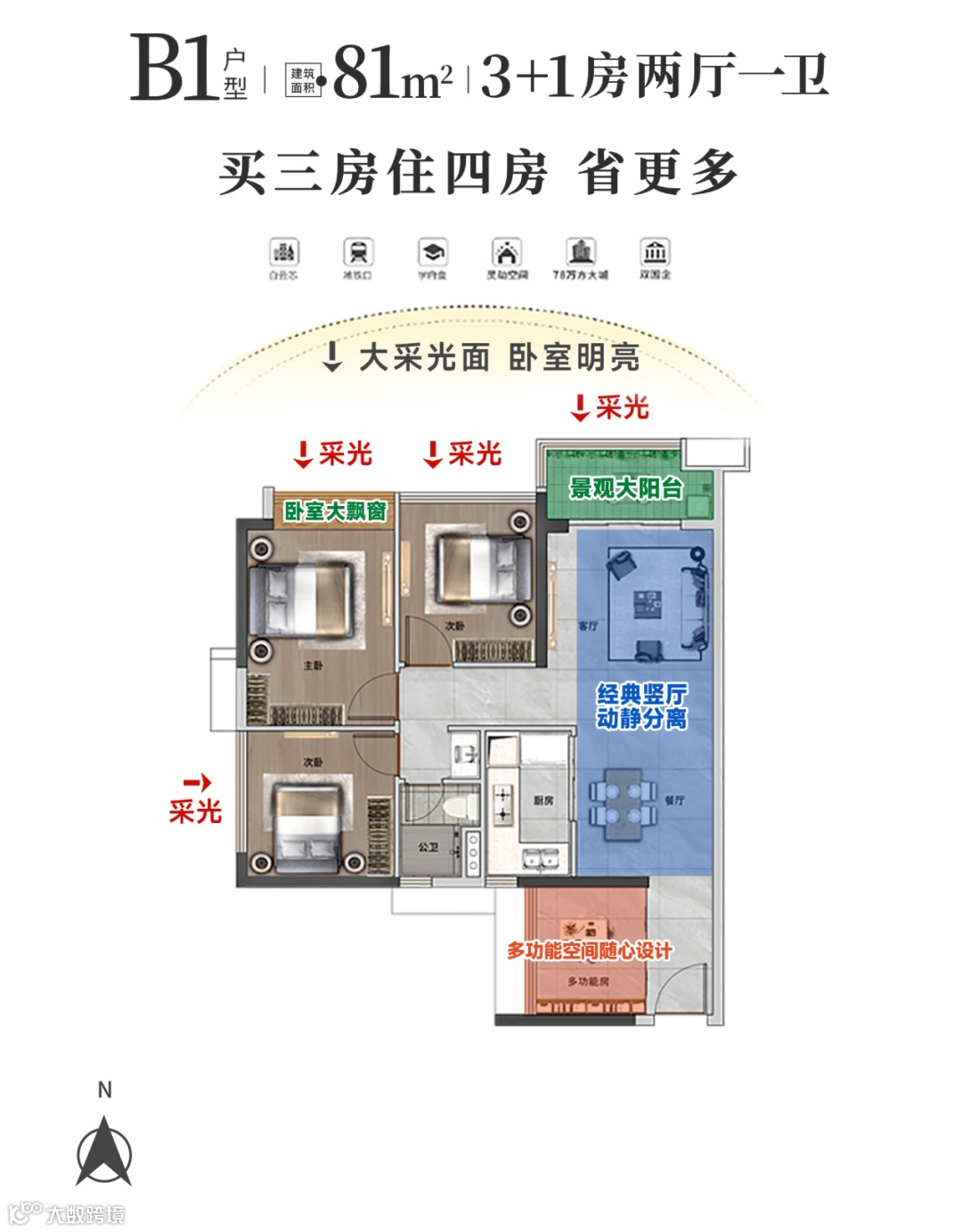 自带主套+双卫生间给了主人足够的私密生活体验;面积不到90㎡,能做到四房,堪比越级享受;而且是南向三开间,兼顾舒适度与实用性。如此高性价比,可谓逢推必罄,堪称项目“断货王”。